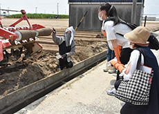 学生らは永井代表取締役からニンジン栽培の歴史や年間を通しての作業について説明を受けたあと、専用の機械での播種作業を見学しました。学生らは始めて見る機械での播種作業に感嘆の声を漏らしました。「想像していたよりも機械化が進んでいた。畝を立てながら一度に4列も植えることができて、とても効率的だと感じた」「将来管理栄養士になって子どもたちに野菜について説明する際に、今回の見学は絶対役に立つと思う」と話しました。