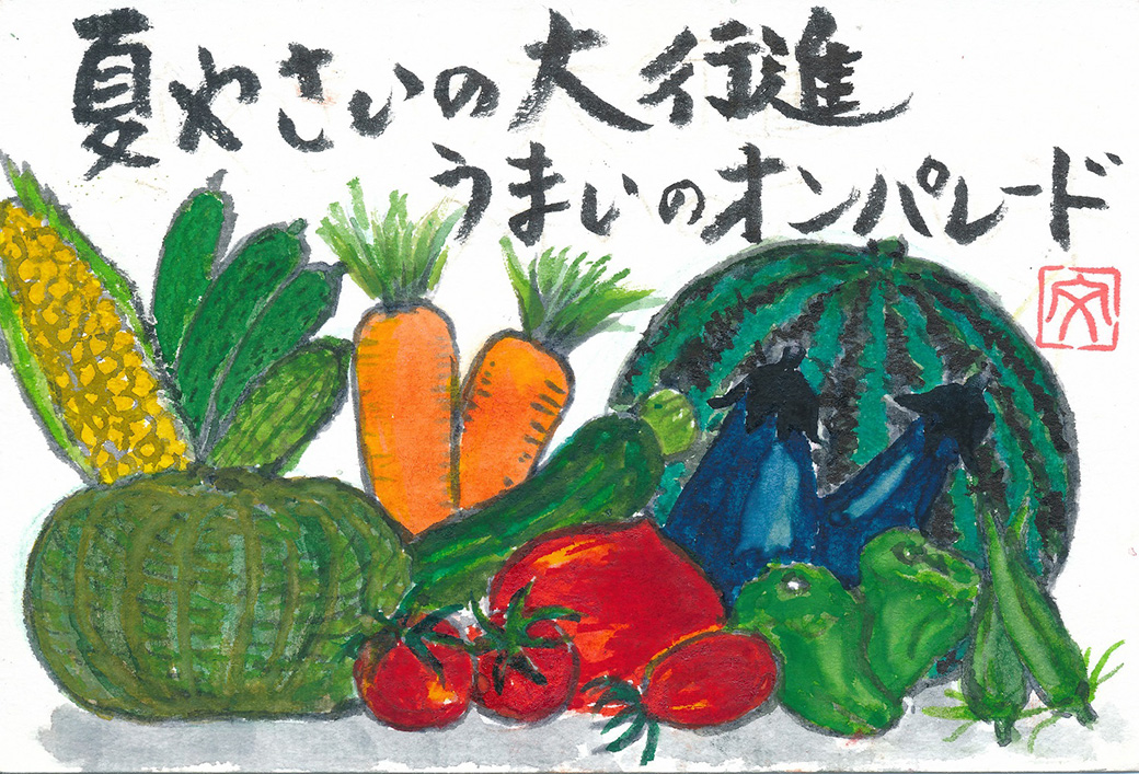 私は産直に出荷している生産者の一人です。野菜のおいしさを伝えようと絵手紙を始めました。今回の受賞は大きな励みとなり、とても感謝しています。「碧海そだち」の野菜たちに日々かこまれて毎日イキイキさをいただいています。これからも心穏やかにおいしい野菜と絵手紙を作り続けていきます。