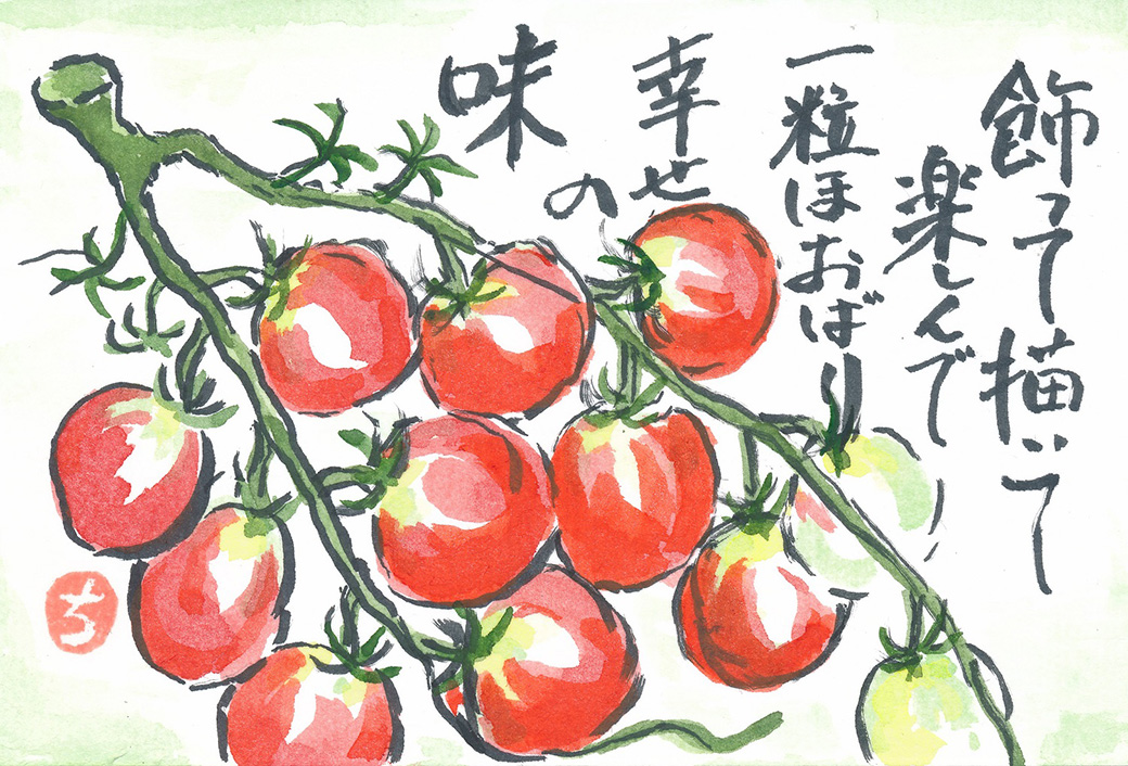 家庭菜園を楽しんでいます。色々な野菜等が身近にでき、絵を描いたり、食したりできます。このたび、自家栽培のミニトマトを描いた絵を選んでいただき、すごく嬉しいです。ありがとうございました。野菜作りは楽しい事いっぱいです。