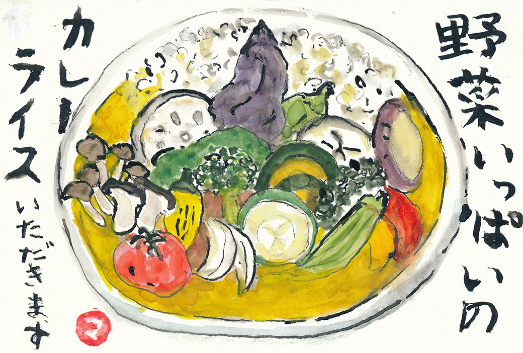 今回入賞できてとてもうれしいです。ありがとうございます。色々な野菜を工夫して並べて一生懸命描きました。野菜はカラッと揚げればうま味がアップし、蒸したらヘルシーにいただけます。