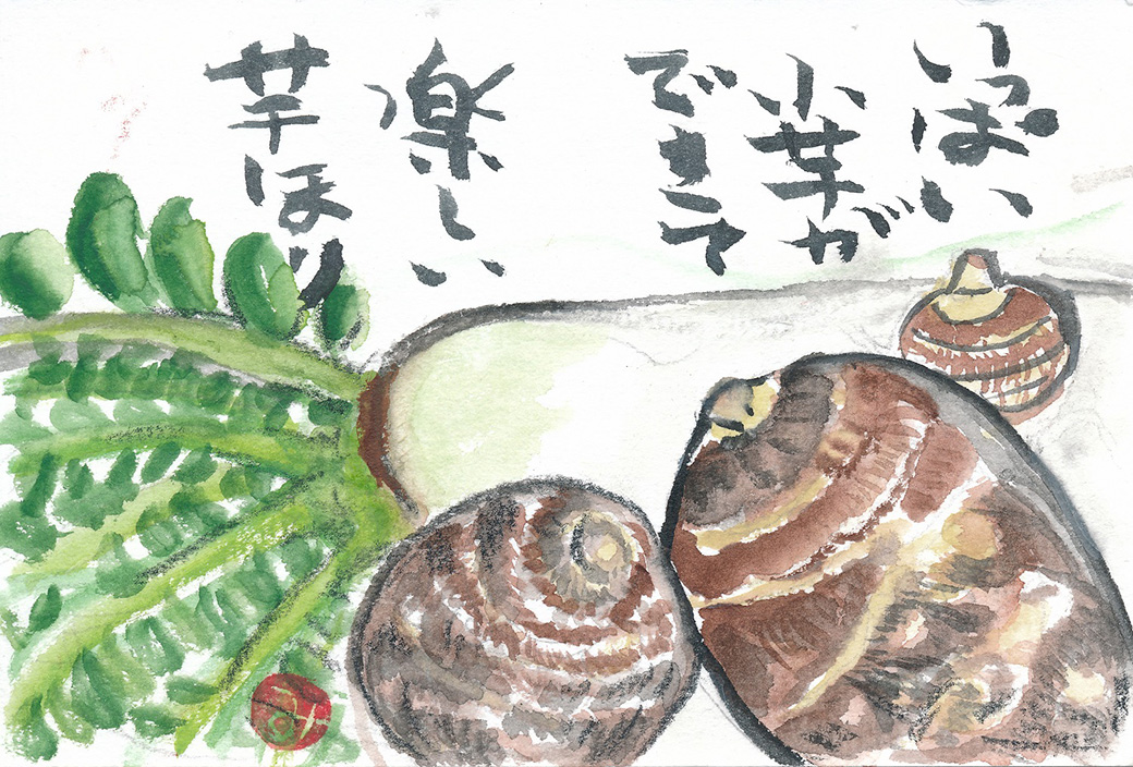絵手紙教室では、季節の野菜や花を書きます。野菜を庭で作ったり、友達にもらったりします。私は里いもが大好きです。今回は、カレンダーに出してもらってすごくうれしいです。ありがとうございました。