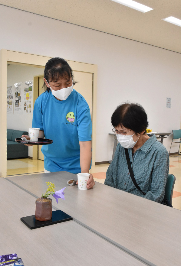 感謝デーは、通常より多くの利用者が来店するうえ、手続きに時間がかかります。コーナーでは、来店者が、待ち時間を少しでも気持ちよく過ごせるよう支店2階で、同組織の役員が飲み物と茶菓子をふるまっています。