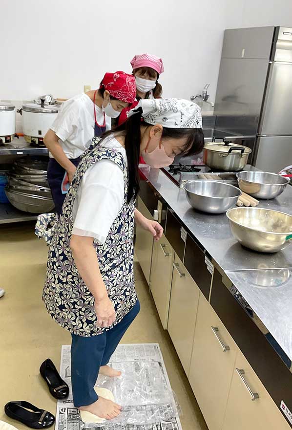 この日は、ブロック管内で農業を営んでいる愛知県農村生活アドバイザーが講師を務めました。参加者は、うどんの生地作りから挑戦。材料を混ぜ合わせて生地を作り、足で踏んでコシを出しました。生地を寝かせている間には、農村生活アドバイザーから、旬を迎えているラッカセイの茹で方やショウガの保存方法など農家ならではの情報を伝えました。調理後には、旬の味を家で楽しんでほしいと、農村生活アドバイザーが育てたラッカセイを参加者にプレゼントしました。