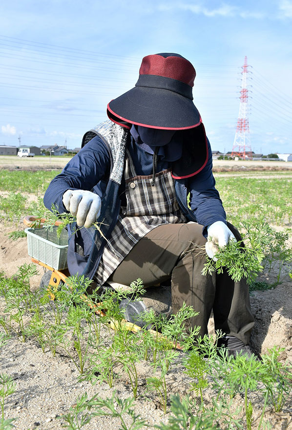 同市は県内一のニンジンの産地。部会は、同市南部地区を中心に101人が約110ヘクタールで栽培しています。ニンジン独特の臭みが少なく甘味が強いのが特徴で「へきなん美人」のブランド名で、中京市場を中心に、北陸や関西地方に出荷しています。