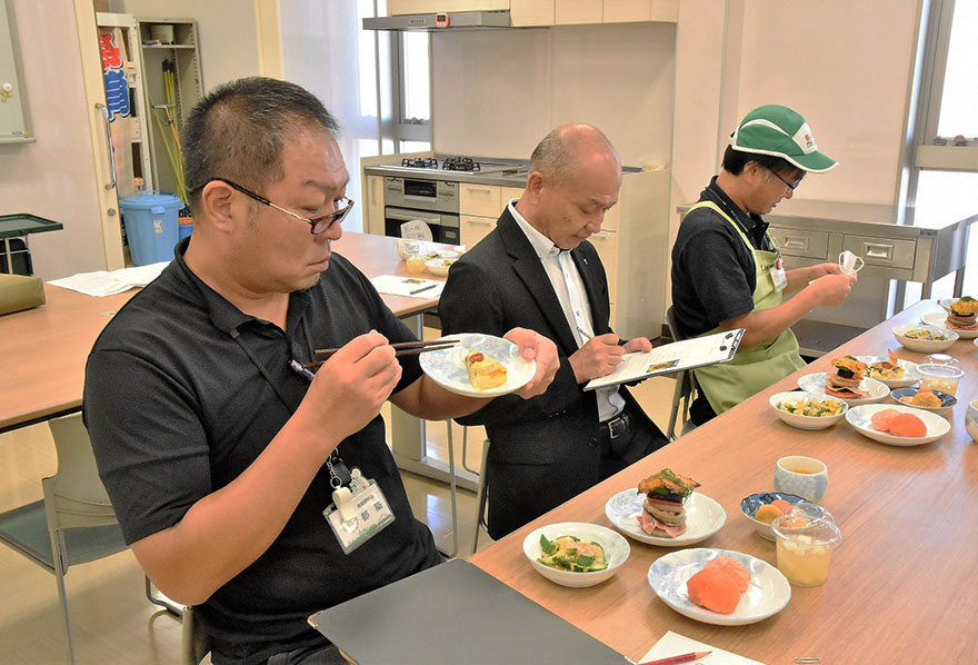 できあがった料理の見た目や味などを審査する野澤常務(中)ら