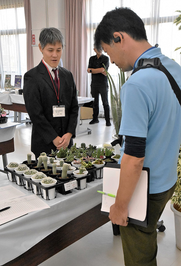 JAあいち中央安城市温室園芸組合は10月9日、安城市赤松町のJA総合センター内生活館で生産者と市場関係者らによる商談会「秋の見本市」を開きました。見本市には、19人の生産者がブースを設け、シンビジウムや和物、観葉植物などの秋から年末年始に向けた商品を展示しました。商品をPRし、商談につなげることを目的に、毎年10月と3月の年2回、開いています。