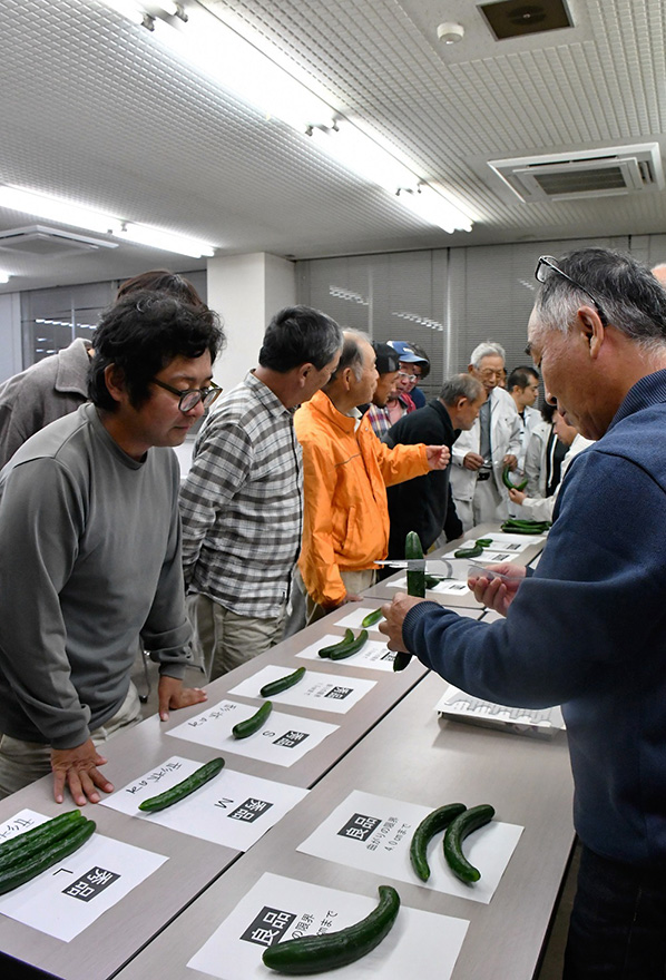 JAあいち中央胡瓜生産部会は10月30日、安城市赤松町のJA総合センター内管理棟で冬春キュウリの目ぞろえ会を開きました。部会員や県、JAあいち経済連、市場担当者ら約40人が参加。出荷計画や販売方針、市場情勢、出荷規格などの説明を受けた後、サンプルを手に取り、太さや長さ、色、曲がりなど規格を確認しました。