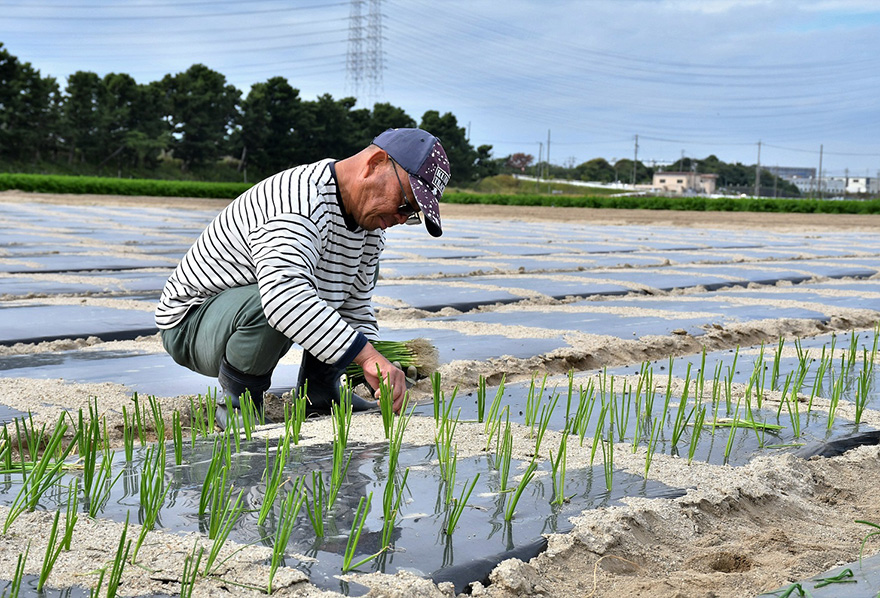 JAあいち中央管内の碧南市で特産「へきなんサラダたまねぎ」の定植作業が10月中旬から始まりました。今年は9月の播種以降気温の高い日が続きましたが、10月に入り気温が下がり適度な雨もあったことから順調に生育。定植作業は11月下旬まで行われ、出荷は3月中旬から始まる予定です。