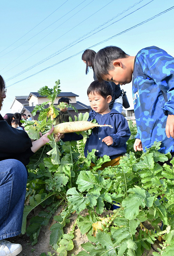 市内から27家族約80人の親子が参加し、ダイコンとサニーレタスの収穫を楽しみました。この日収穫できなかった野菜は、12月末までに生育状況を確認しながら各自で収穫します。同農園で事前に収穫したダイコンと同組合員が提供したサトイモを使ったおでん煮の振る舞いも行われ、参加者は味が浸み込んだダイコンなどを堪能しました。