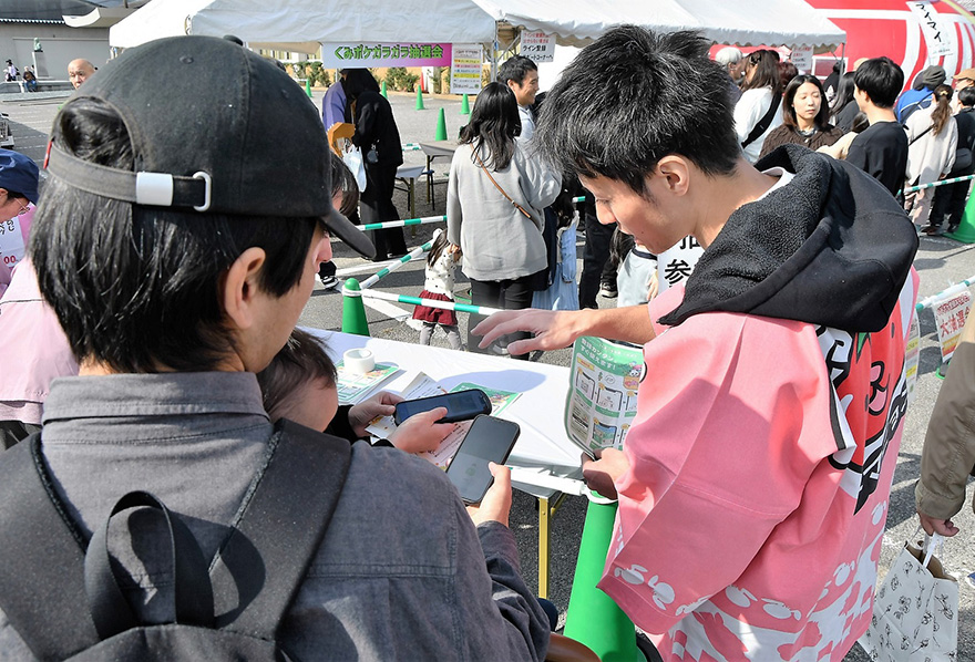JAまつりで来場者に「くみポケ」について説明する同JA職員