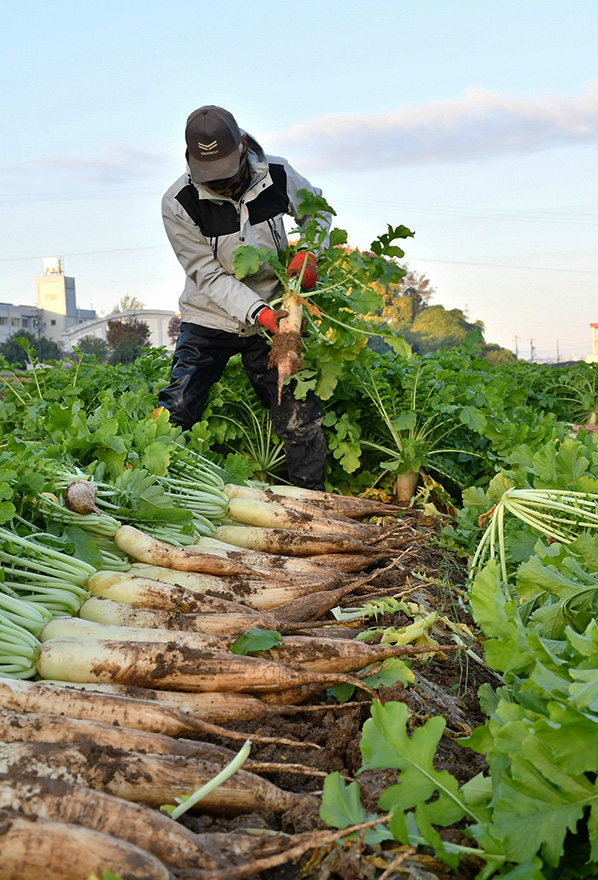 JA刈谷露地園芸部会の永田憲正さんは、刈谷市東境町の約8アールの圃場でダイコンを栽培。早朝から、1本ずつ手作業でダイコンを引き抜き、余分な葉としっぽを切り落とします。その後、作業場で土を洗い流し、軽く乾かした後サイズごとに選別し箱詰めします。