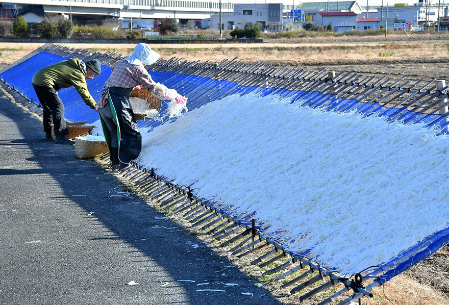 切り干し大根づくりは、ダイコンを専用の機械で15センチほどの細切りにした後、田んぼや畑に設置した網棚の上いっぱいに広げます。冷たい「伊吹おろし」にさらして2日程天日干しすることで、水分が飛び、しっかりとした歯ごたえのある、甘みと旨みが凝縮された切り干し大根になります。