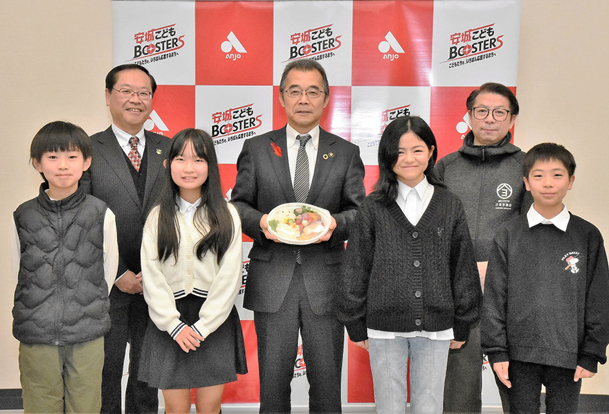12月22日には、同校の代表児童4人と同社の4代目・神谷豊明代表取締役社長が、同市桜町の安城市役所で三星元人市長を表敬訪問し、弁当が完成したことを報告。児童は、弁当に込めた想いやこだわりを発表しました。発表後は、弁当を試食しながら三星市長と意見を交わしました。