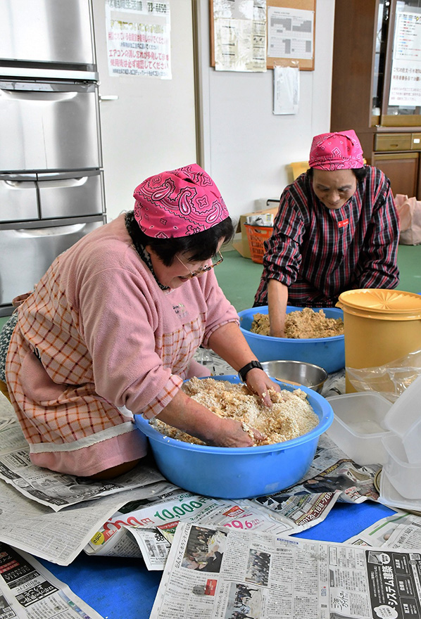 潰した大豆と塩切麹を混ぜ合わせる大豆の会役員