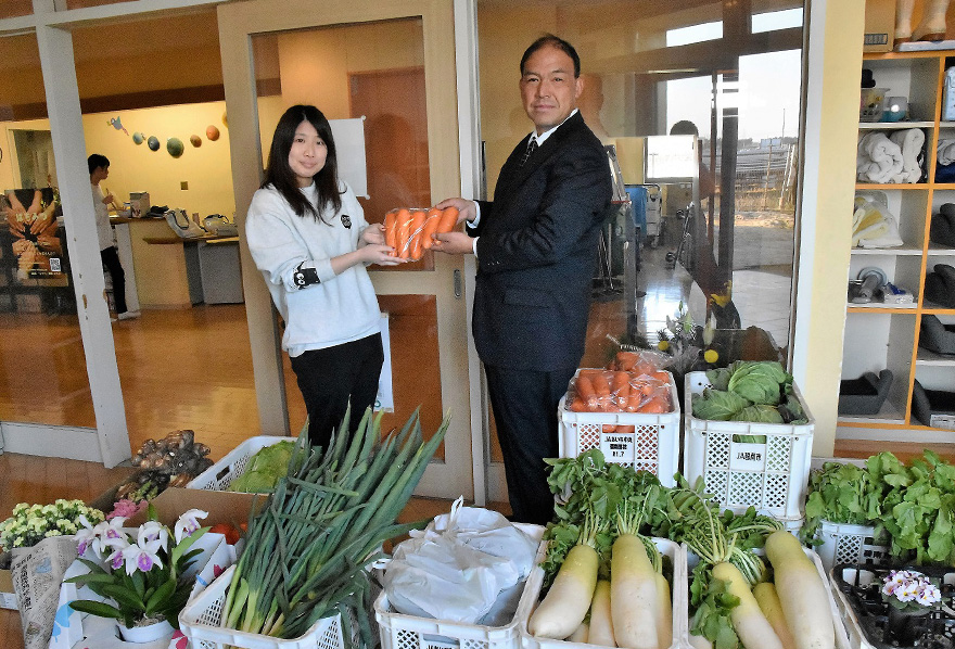 JAあいち中央は1月18日、碧南地区農業まつり農畜産物総合共進会に出品された農産物を碧南市内の児童養護施設に寄贈しました。JA碧南地区運営協議会の禰冝田諭会長が、同市江口町の社会福祉法人長寿会児童養護施設オリーブを訪問。同市特産のブランドニンジン「へきなん美人」やトマト、ダイコンなど14品目111点の野菜と約2.4kgの大豆や黒豆など穀類、9種類の花き類を手渡しました。