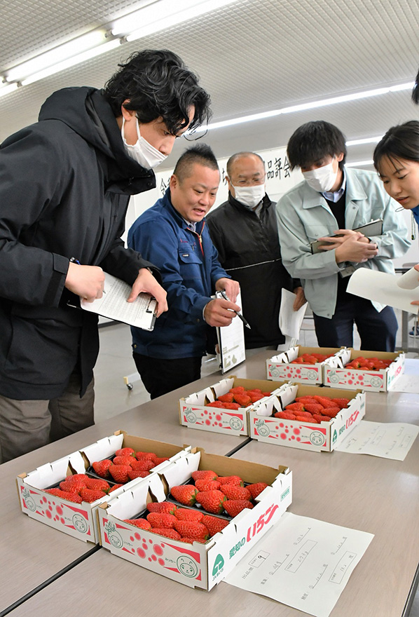 イチゴの外観や大きさ、玉ぞろいなどを確認する審査員