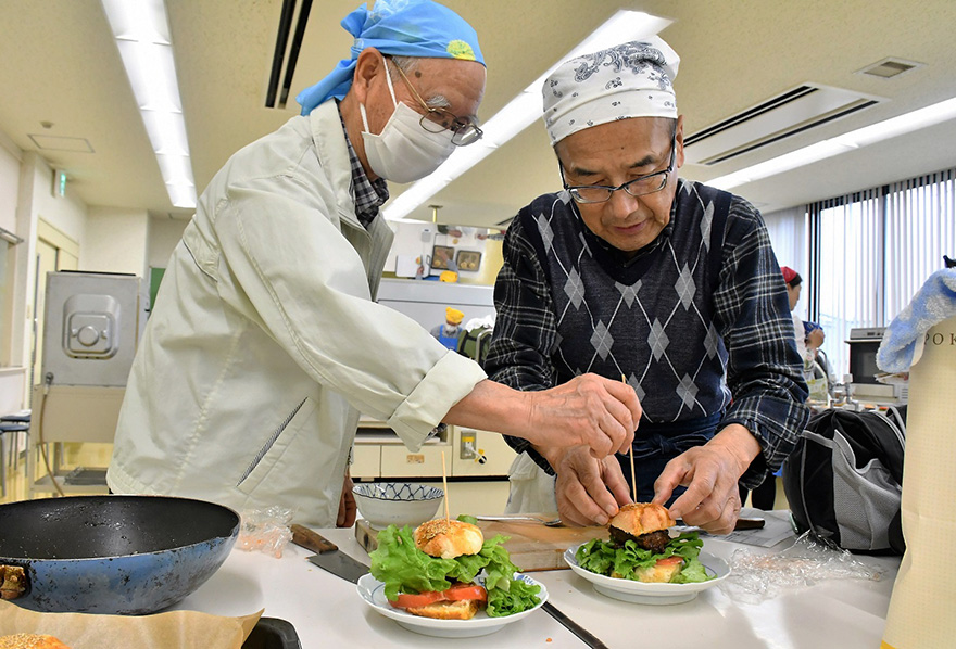 今回作ったメニューは「米粉のてりやきバーガー」と「電子レンジで簡単!枝豆コーン」の2品。参加者9人と同ブロック職員は、2人1組で調理を進めました。参加者は「米粉のてりやきバーガー」の、米粉バンズの生地作りと成型、パテ作りと成型に苦戦しながらも、ペアで協力して完成させました。参加者は「家で一人ではできない。みんなでわきあいあいとやるから楽しく作れる」「同じ料理を作るのは大変だからできない。でも、調理の仕方は参考になり、毎回役立っている」と話しました。
