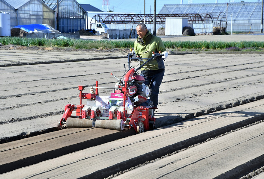 JA碧南しょうが・しそ部会の長坂貞義さんは、約50アールで赤シソを栽培します。肥料を施し整地した畑に、刈り取り機の大きさに合わせた約100センチ幅で筋を切り、一畝に4列ずつ、機械を引きながら種をまきました。収穫までに2回ほど土寄せをして畝を作ります。