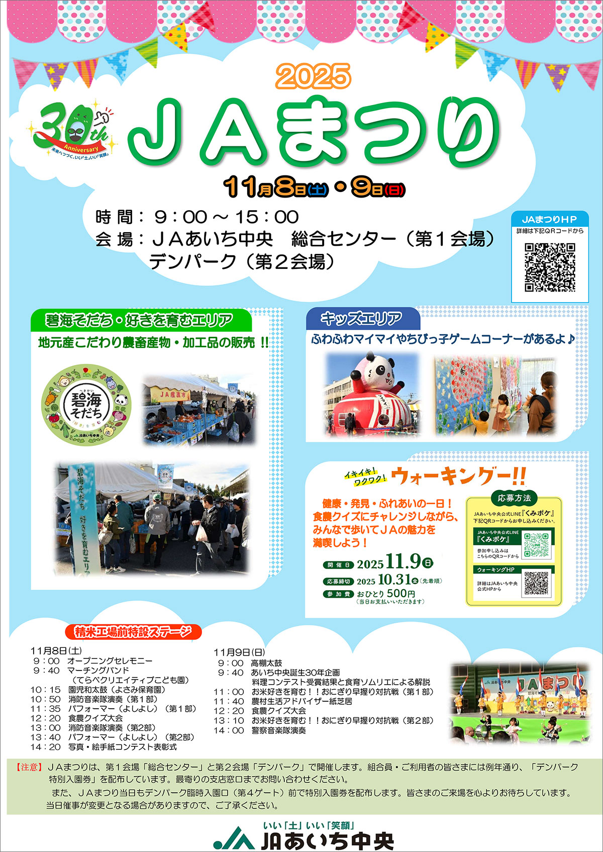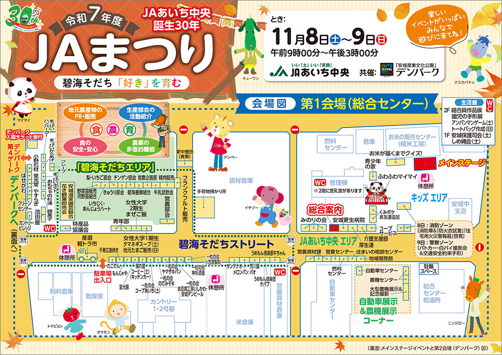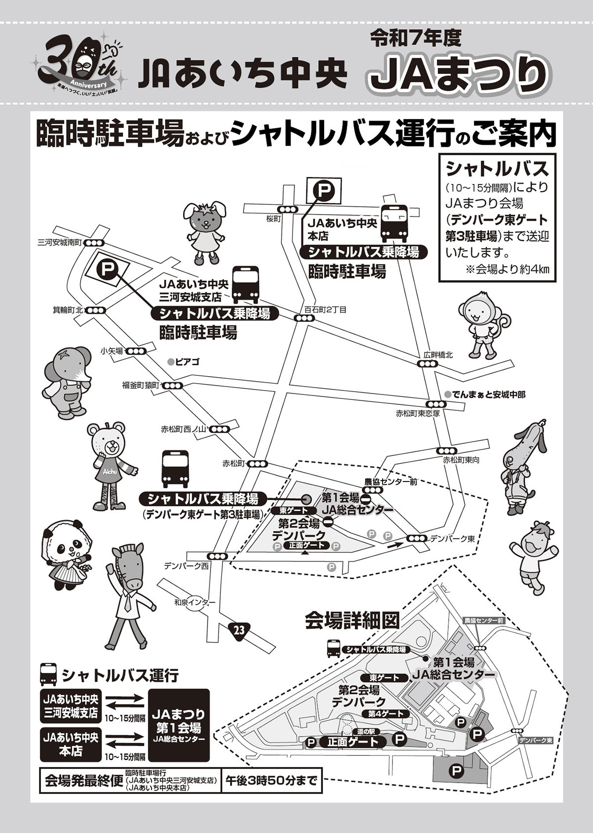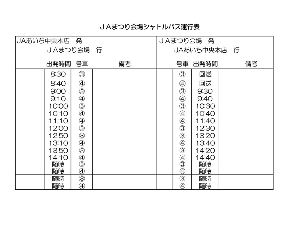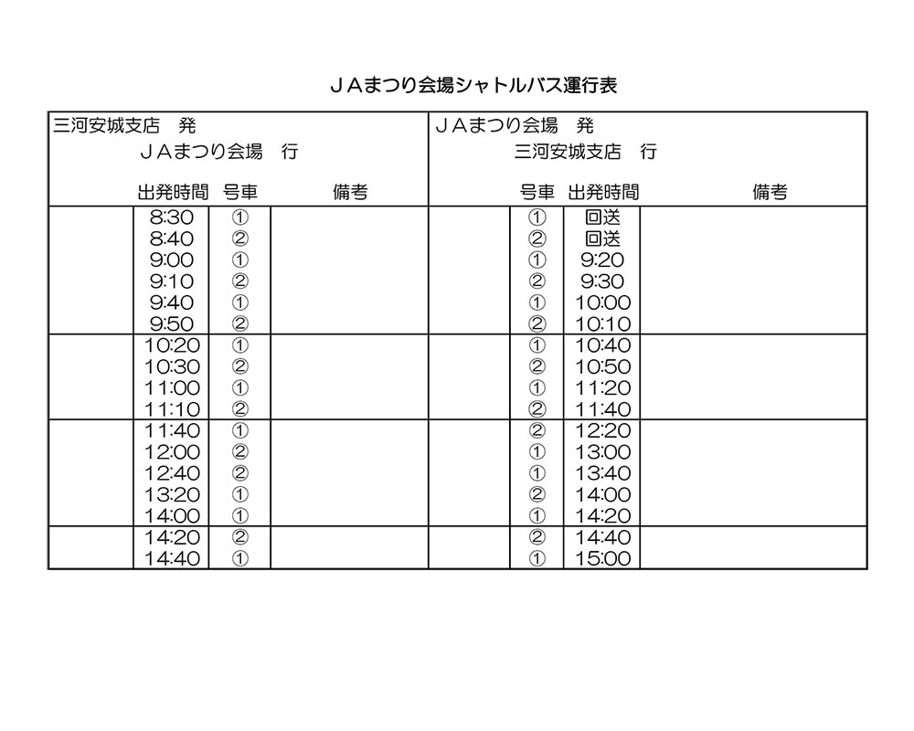 当日はJAあいち中央本店⇔JAまつり会場 三河安城支店⇔JAまつり会場のシャトルバスも運行しておりますので、ご利用ください。