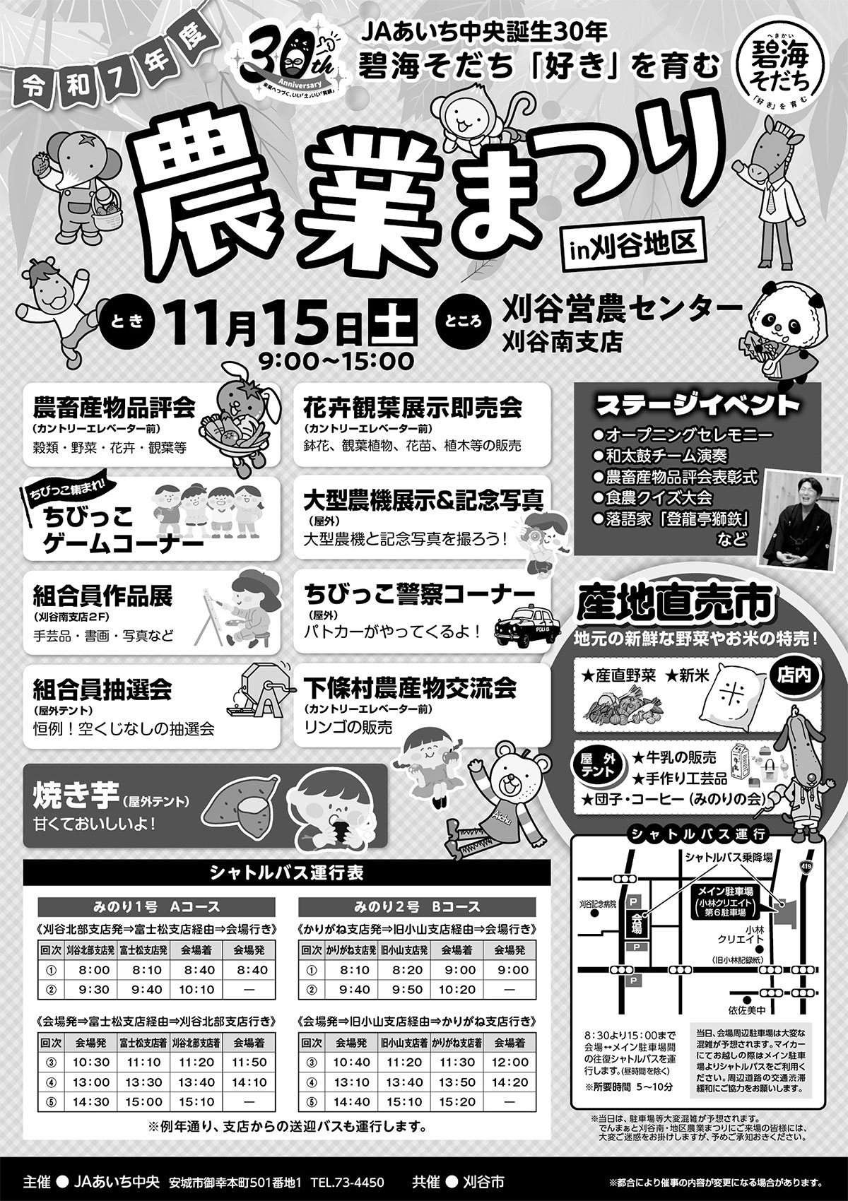 お知らせ 刈谷地区農業まつりを開催します! イベント・活動報告 2025/10/28 農業まつりin刈谷地区! 11月15日(土)、刈谷南支店・刈谷営農センター(刈谷市小垣江町八角151)で刈谷地区農業まつりを開催します。 地元農畜産物を使用した美味しい食べ物の販売や、名古屋で大人気の落語家 登龍亭獅鉄さんの落語会、さらに多彩なパフォーマンスが楽しめるステージなどを行います。 開催時間は午前9時00分~午後3時00分 是非、ご来場ください! ■お問い合わせ先組織生活部組織生活課 0566-73-4450 一覧へもどる