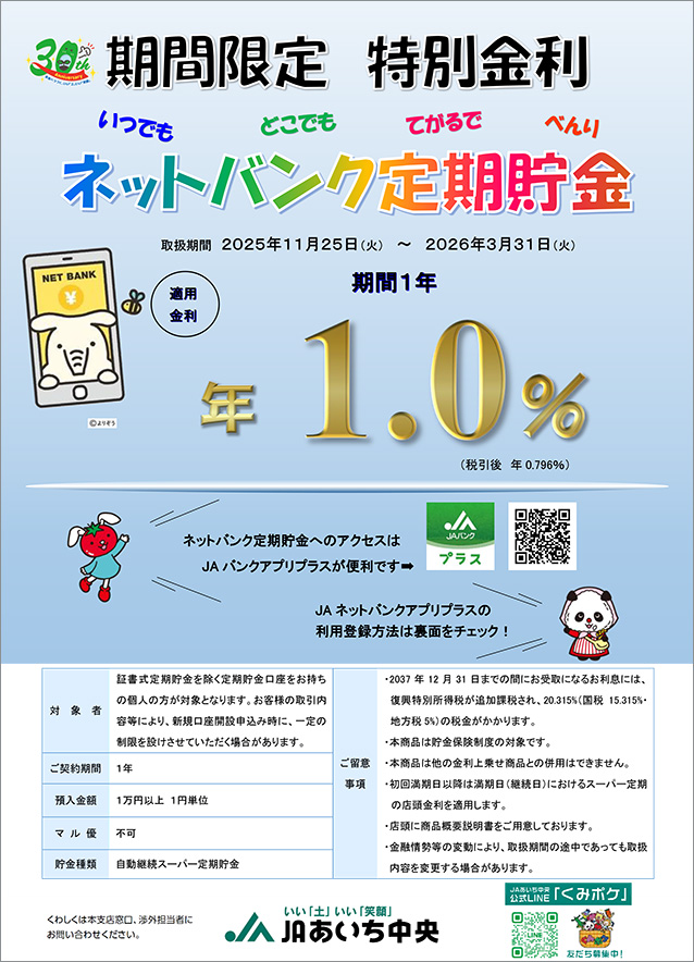お知らせ 期間限定 特別金利「ネットバンク定期貯金」のご案内 JAバンク・JA共済 2025/11/25 JAあいち中央では、本日より2026年3月31日(火)まで期間限定 特別金利「ネットバンク定期貯金」を販売いたします。 いつでも、どこでも、手軽で便利!! JAあいち中央誕生30年を記念し大変お得な商品となっております。 詳しくは右のチラシをご覧いただくか、お近くの本・支店窓口、渉外担当者にお問い合わせください。 営業店一覧はこちら 大きなサイズで見る 一覧へもどる