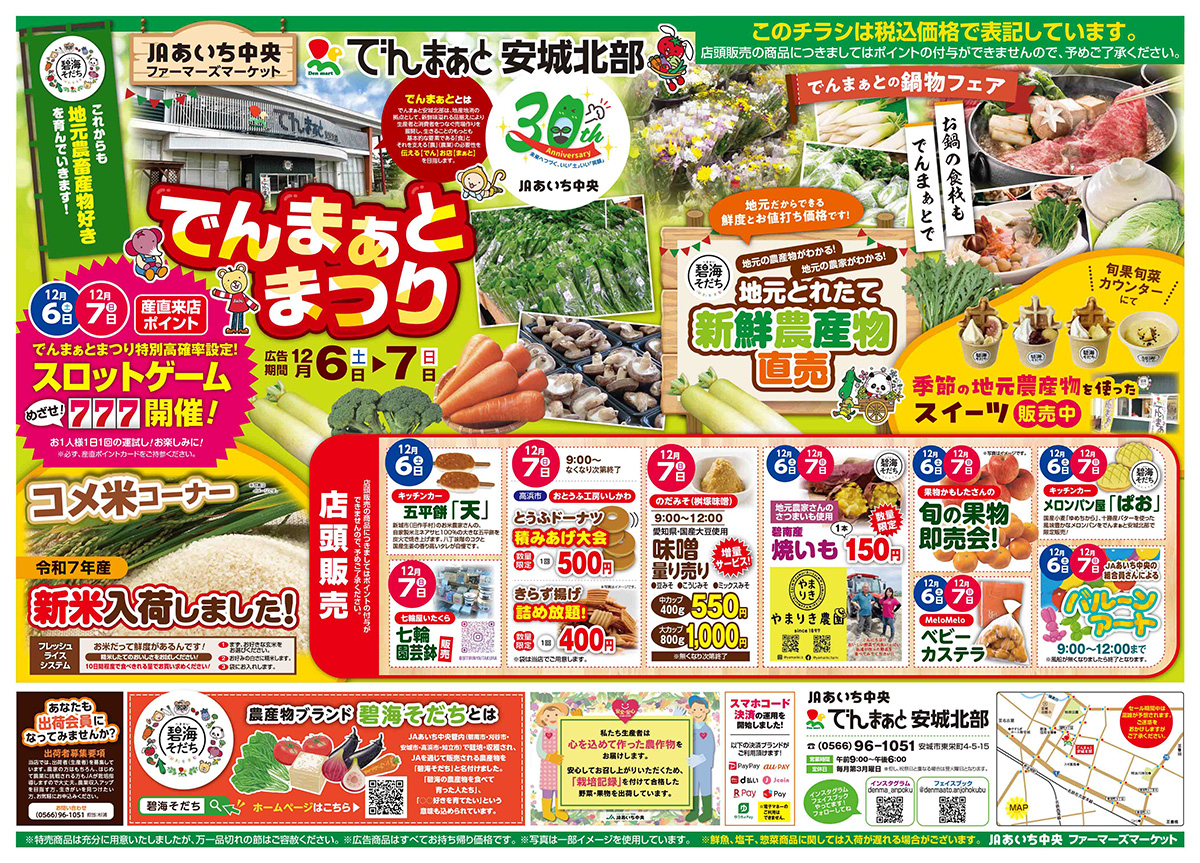 お知らせ でんまぁと安城北部「でんまぁとまつり」開催のご案内 食と農 2025/12/5 12月6日(土)・7日(日)の2日間、「安城北部 でんまぁとまつり」を開催いたします。 地元とれたての新鮮農畜産物、かもしたさんの旬の果物即売会、あったか鍋物フェア等、 碧海そだちが盛りだくさんです。詳細は、下記の広告をご覧ください。 大きなサイズで見る 大きなサイズで見る 一覧へもどる