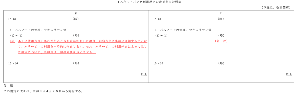 当組合では、フィッシング詐欺等の金融犯罪への対策として、令和8年4月20日(月)付でJAネットバンク利用規定の改正を予定しています。