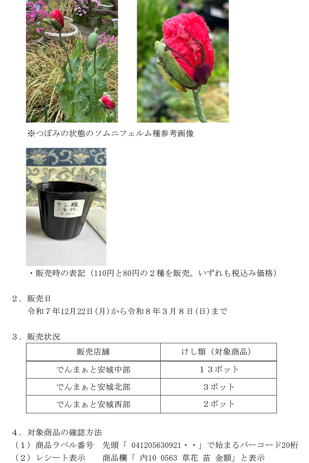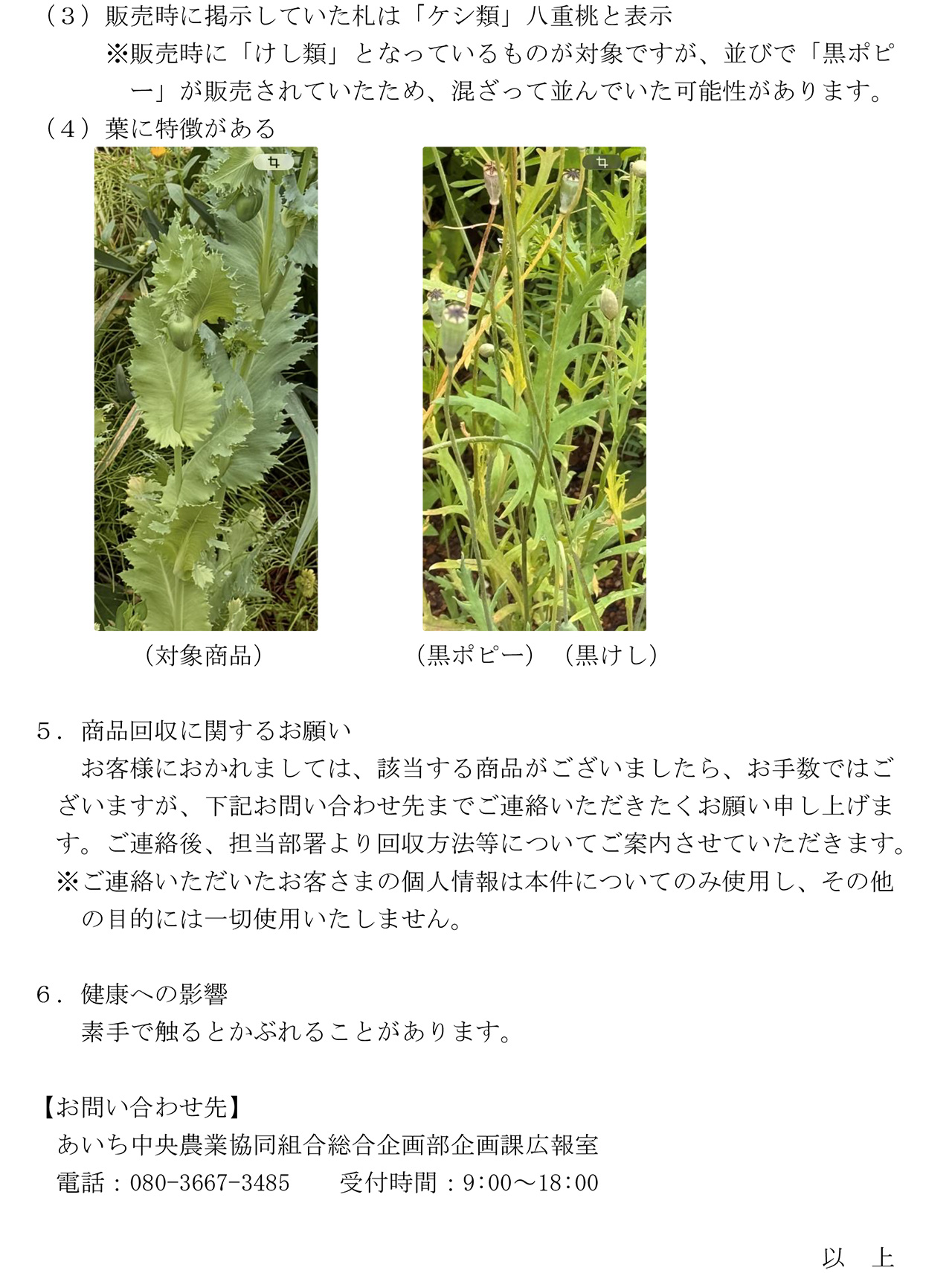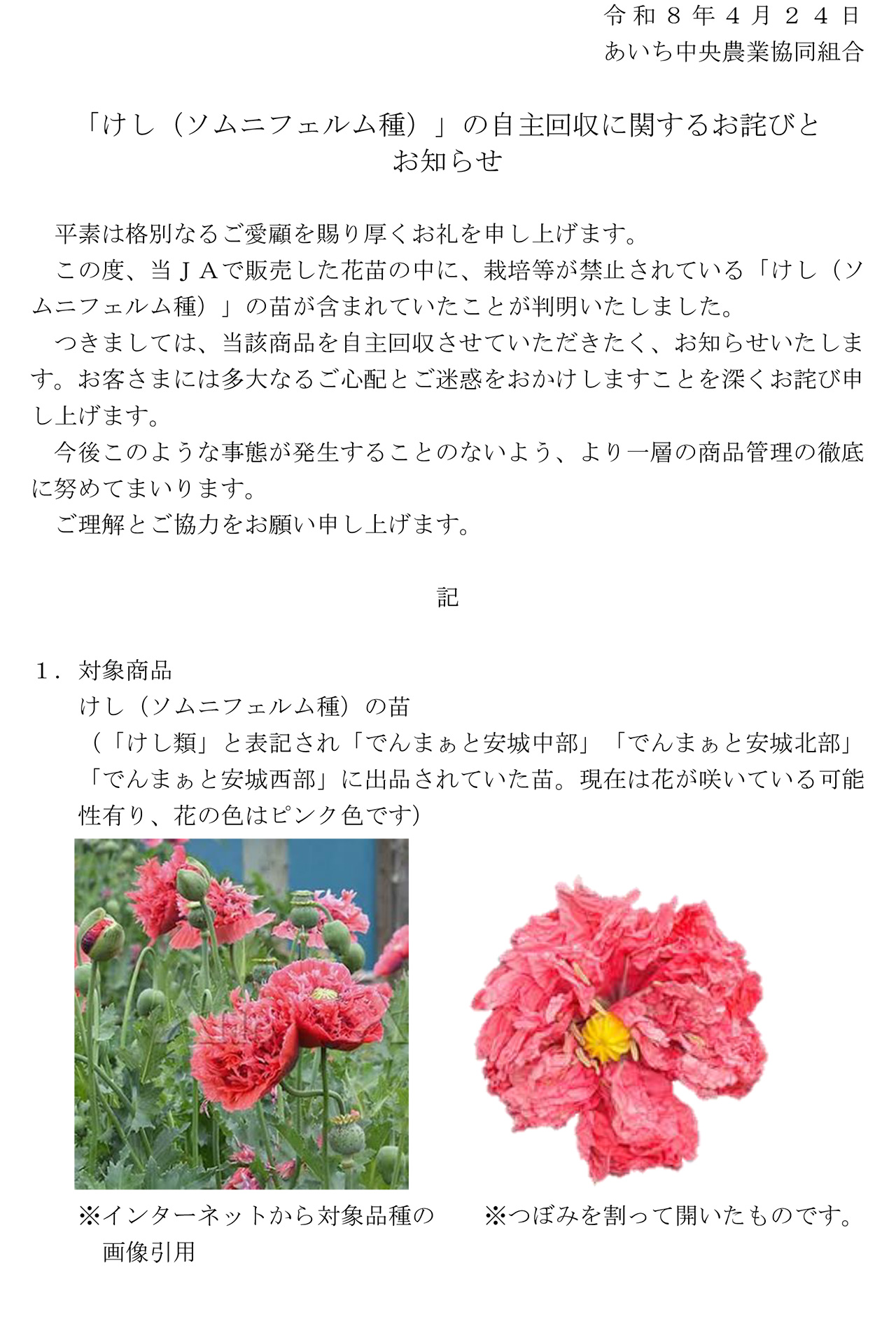「けし(ソムニフェルム種)」の自主回収に関するお詫びとお知らせ